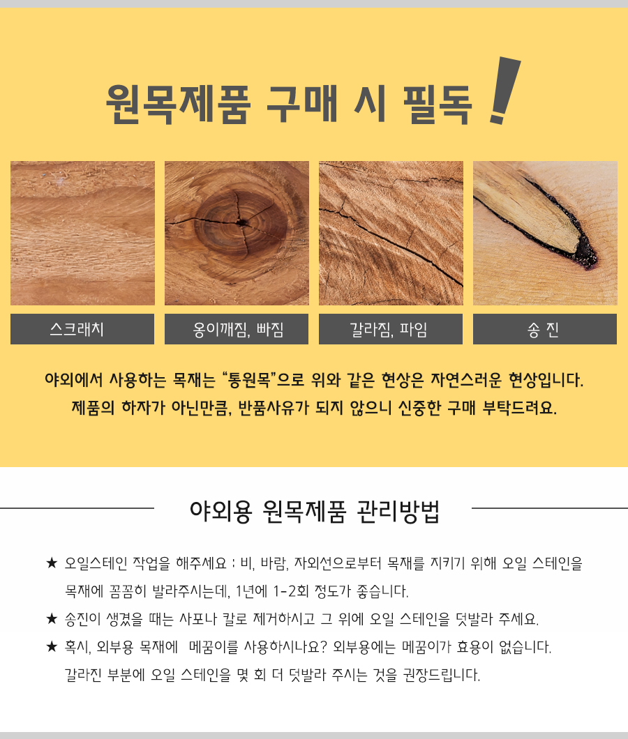 - 원목에 가장 가까운 집성목의 특성상 수축과 팽창으로 휨, 갈라짐, 옹이, 옹이빠짐 등이 있을 수 있으므로 이는 교환/반품/